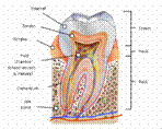 Diagram of a healthy human molar showing the enamel, cementum, pulp,
