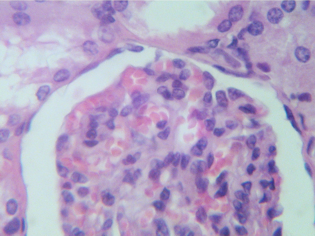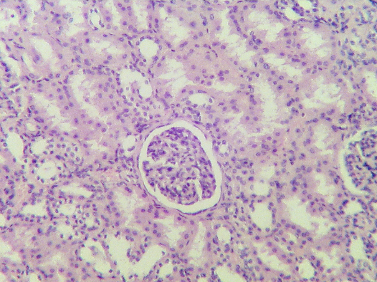 Glomeruli appear as round solid speckled structures. Each is surrounded by a